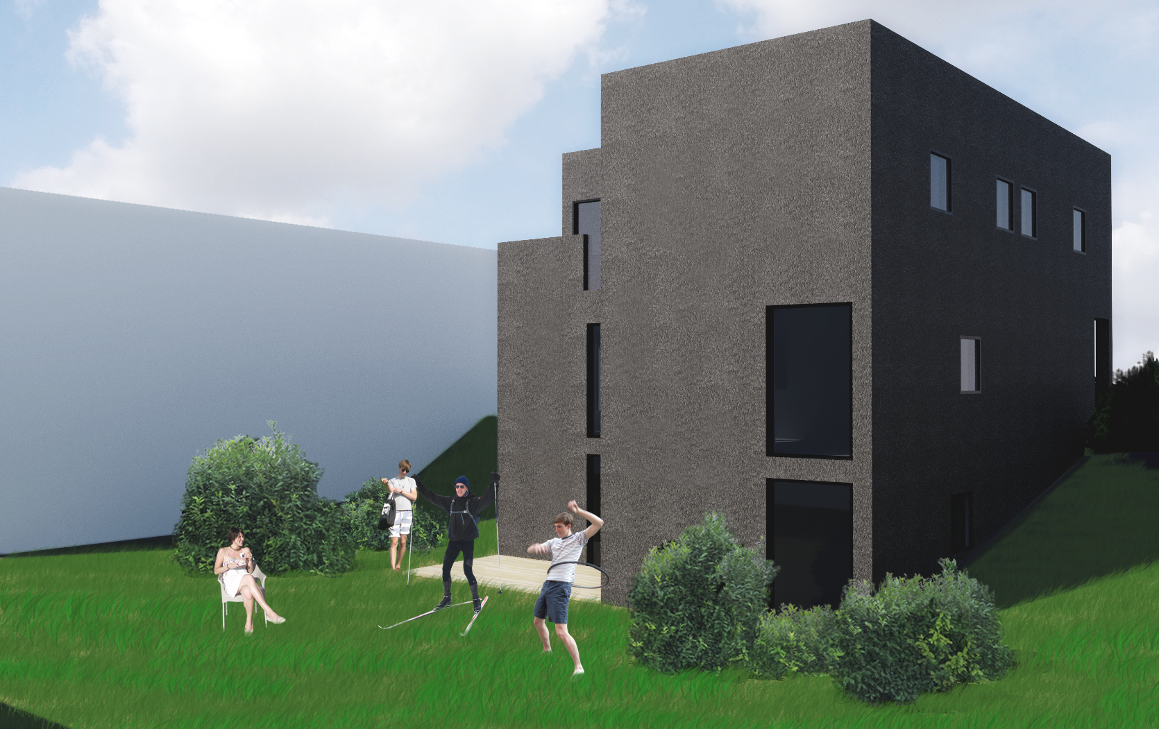 Rétt við húsið er svo svarta húsið þannig þessar „systur“ kallast á og er síðasta húsið sem er teiknað í þessari línu. Það er þó allt aðrar forsendur þar sem þetta er tvíbýlishús. Ég vildi halda í það að aðskilja dag og nótt í verkefninu, en á sama tíma að báðar íbúðirnar nytu kosti þess að vera á tveimur hæðum. Skipulagið á svæðinu leyfði kjallararými sem gaf aldeilis tækifæri til frekari nýtingu húsnæðisins. Íbúðirnar flæða því á milli hæða, og stærri íbúðin er á þremur hæðum.